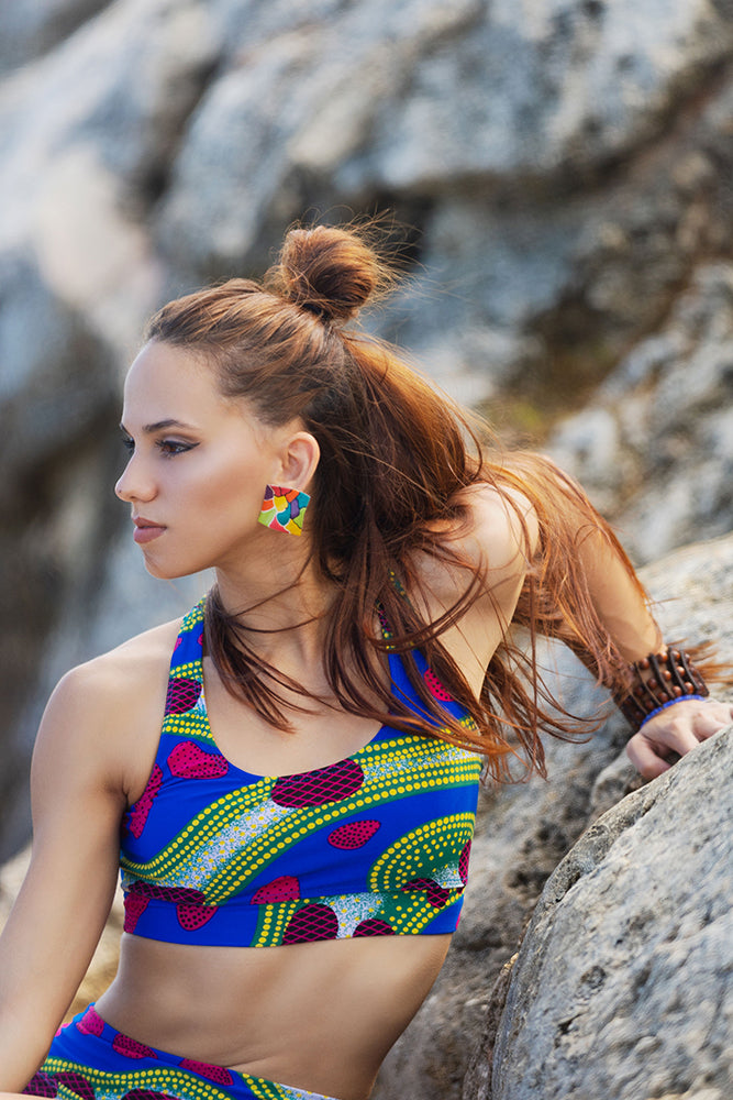 The Yoga outfits are made with 92% recycled polyester and 8% spandex fabric, with a buttery soft brushed texture on both its sides. The fabric feels incredibly luxurious against the skin while remaining both breathable and fast drying. The pattern can vary in position and scale when transformed into a set, making them unique ;)