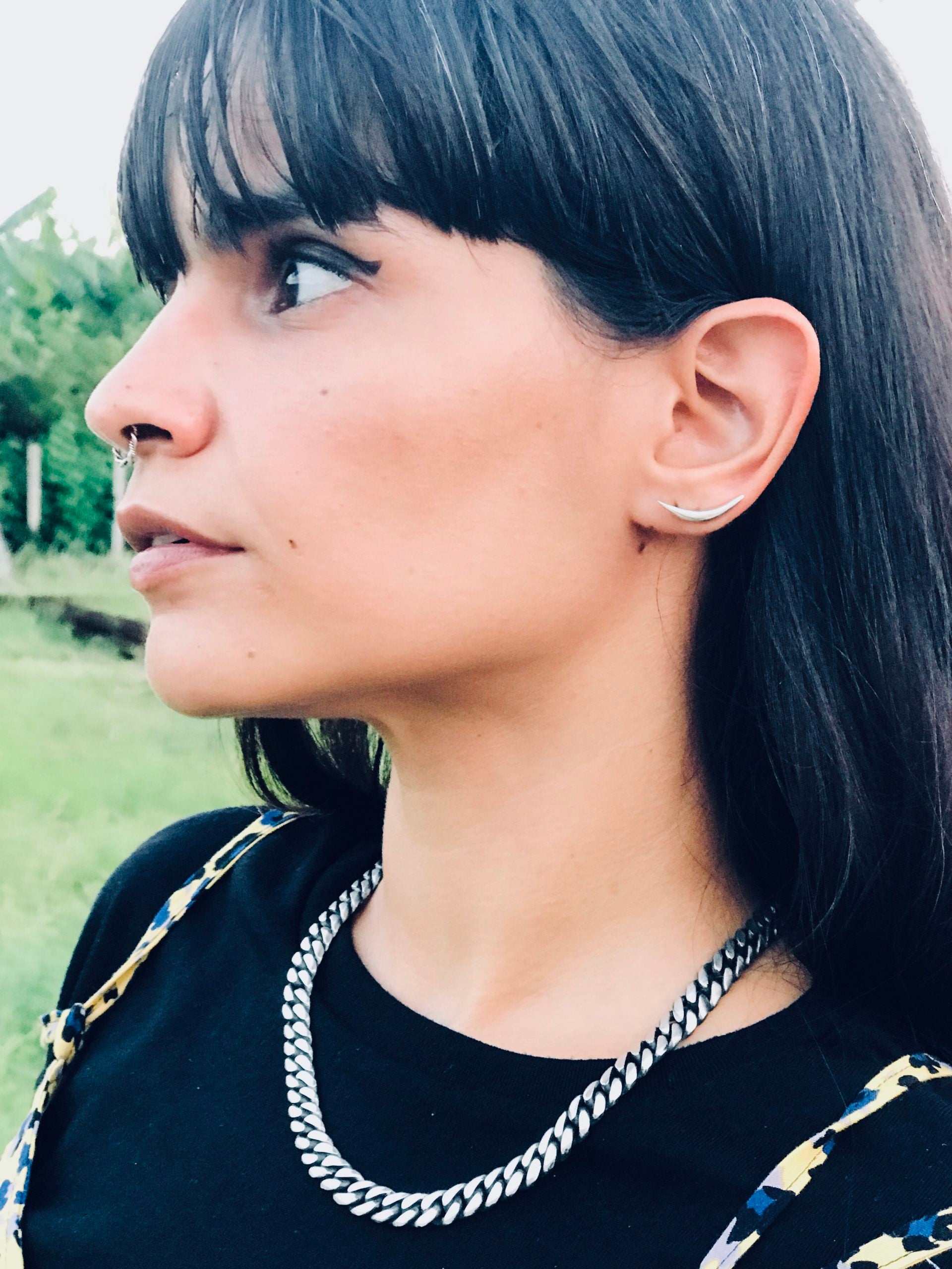 Handmade earrings using an ultra-traditional method, by cutting metal using a saw through soldering. Every jewelry piece is made one by one, staying away from lost-wax casting or 3D technologies.