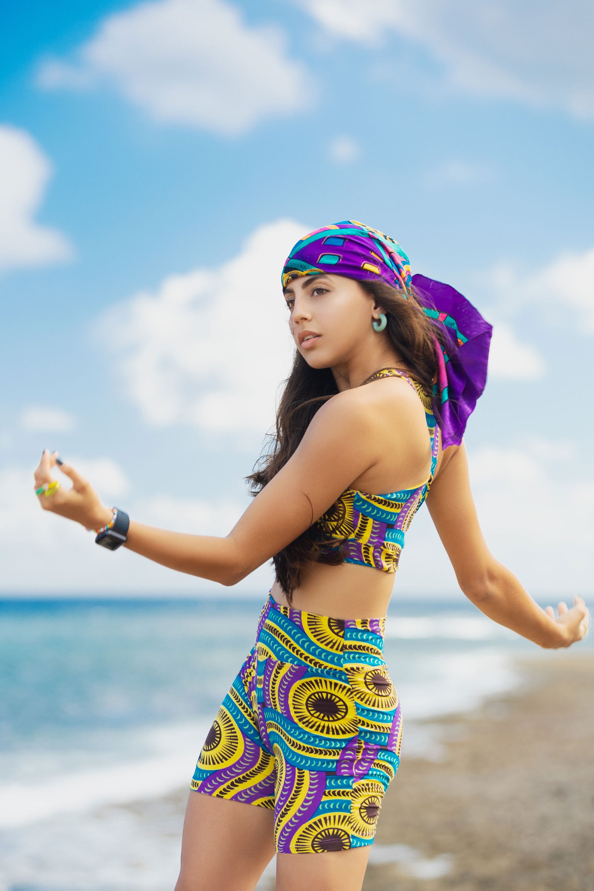 The Yoga outfits are made with 92% recycled polyester and 8% spandex fabric, with a buttery soft brushed texture on both its sides. The fabric feels incredibly luxurious against the skin while remaining both breathable and fast drying. The pattern can vary in position and scale when transformed into a set, making them unique ;)
