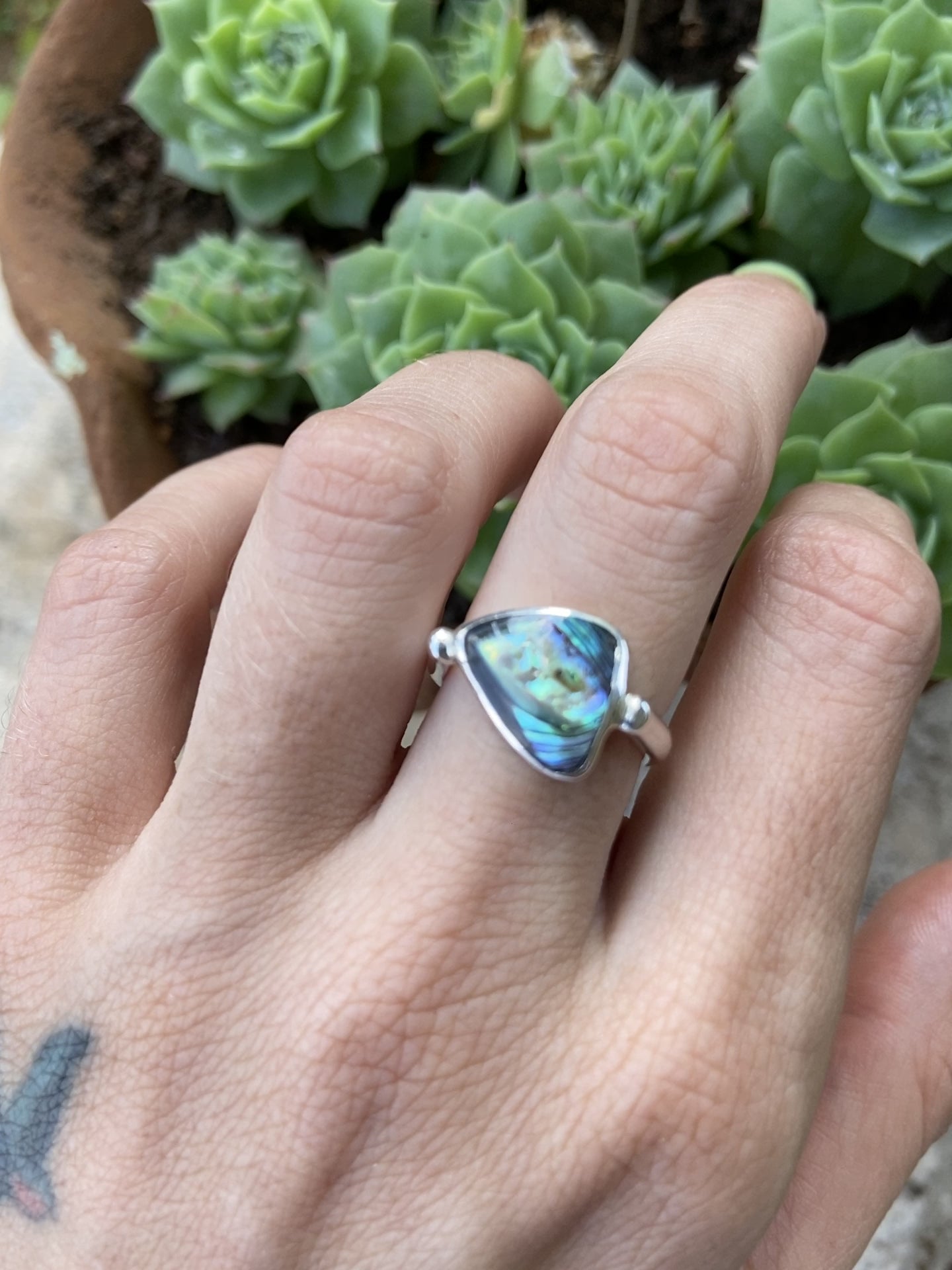 Can you notice that an Abalon fragment is a piece of art itself? Each fragment taken from the shell is unique, so your ring not be the same as the one in the photo.
